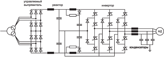 Схема АИТ на рис. 3 была предложена фирмой Ross Hill (США). Такие преобразователи выпускались также компаниями Hill Gracham, Англия (Imvar) и Ansaldo, Италия (Silcovert H). Шкала мощностей этих преобразователей 630–12500 кВт, шкала напряжений – 3300–13500 В.